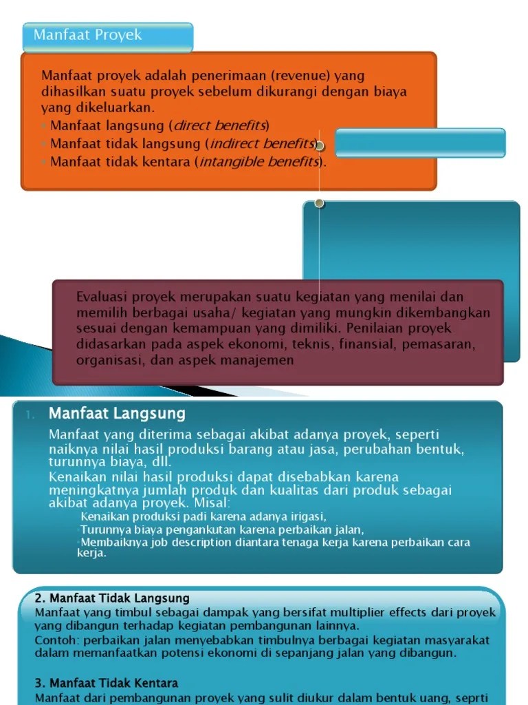 Memberikan contoh kegiatan investasi lainnya dari suatu proyek? Dalam contoh kasus pembangunan jalan tol, idealnya dalam menilai manfaat adalah dengan konsep with and without project, yaitu membandingkan . Besar melalui cost benefit analysis. Ekonomi pembangunan fakultas ekonomi universitas islam riau 2010/2011 proyek perkebunan kelapa sawit di desa koto damai kec. Evaluasi proyek pembangunan sosial pada kelompok masyarak.