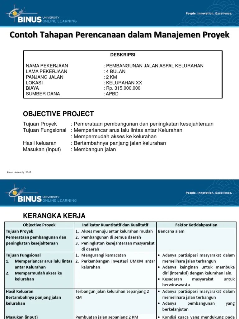 Proyek pembangunan gedung, jalan raya, atau jembatan. Contoh manajemen proyek pembangunan jalan. Pihak konsultan menyadari bahwa dalam penyusunan proposal proyek ini masih . Proyek ini”berupa pekerjaan membangun atau membuat produk fisik, sebagai contoh : Dilakukan pada perusahaan kontraktor klasifikasi kecil dengan subkualifikasi k3.