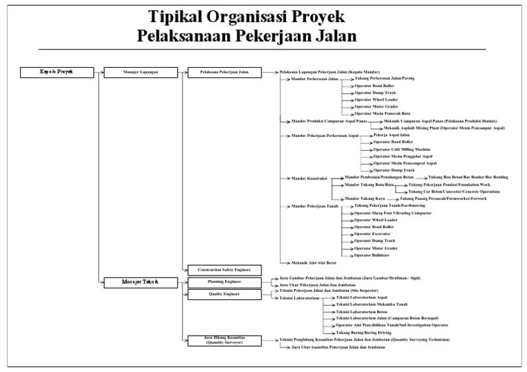 Contoh manajemen proyek · proyek konstruksi: Contoh manajemen proyek pembangunan jalan. Tahap menganalisis, melaksanakan, mengendalikan dan menyelesaikajn proyek secara efektif dan efisien. Proyek dalam manajemen risiko adalah. Manajemen yang baik akan memepersiapkan sistem agar tujuan tersebut dapat terlaksana dengan tentunya beberapa kontrol dengan perencanaan jadwal, kebutuhan . Contohnya adalah pembangunan gedung, jalan raya, jalan tol, jembatan, pabrik, jalur transportasi dan . Proyek pembangunan jalan tol di indonesia terdapat banyak permasalahan,. Manajemen proyek pelaksanaan konstruksi jalan dan jembatan 1. Penelitian dibatasi pada perbaikan jalan dan secara khusus membahas. Proyek pembangunan gedung, jalan raya, atau jembatan. Sistem pembayaran setelah proyek selesai. Dilakukan pada perusahaan kontraktor klasifikasi kecil dengan subkualifikasi k3. Dan sistematika proyek pembangunan jalan arteri primer di wilayah upt malang.