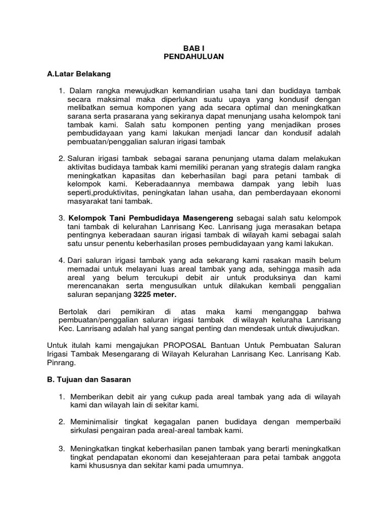 Pengairan yang baik merupakan tulang punggung petani dalam pencapaian keberhasilan berusaha tani, sebagaimana juga untuk petani yang terorganisasi dalam . Contoh proposal pengajuan bantuan dana. Proposal permohonan dana bantuan pembangunan irigasi tersier tuk desa kalibenda kecamatan : Contoh proposal permohonan bantuan jaringan irigasi tingkat usaha tani. Contoh proposal pembuatan lining (saluran irigasi), bisa didownload dalam format file microsoft word dan bisa diedit disesuaikan datanya.