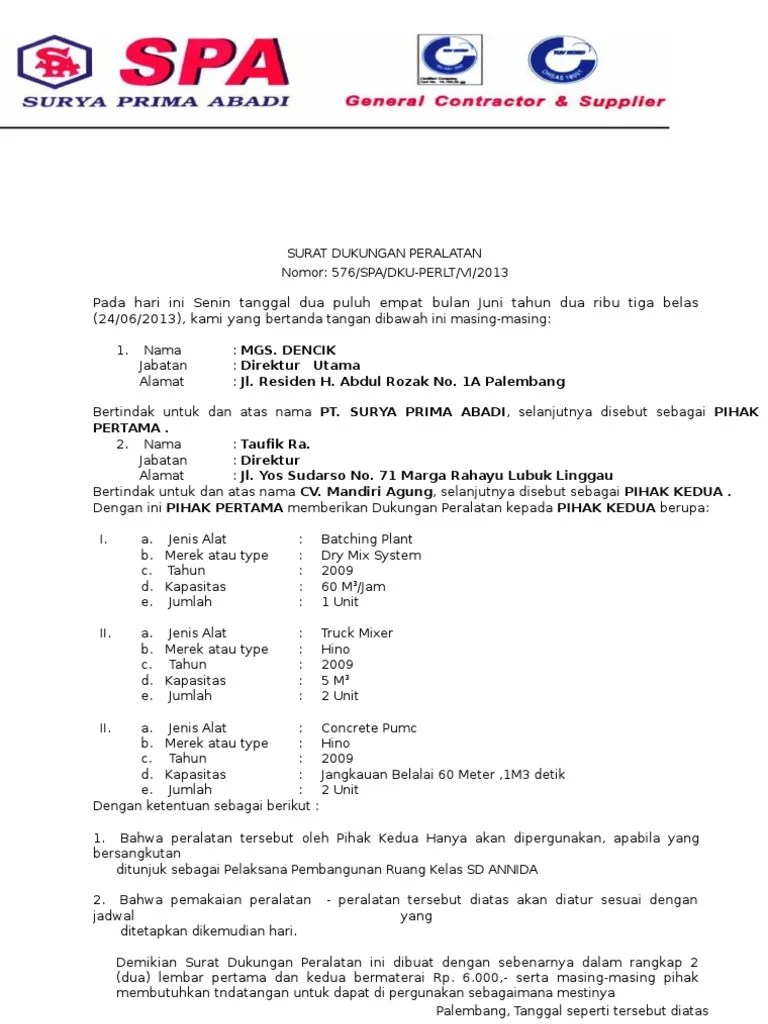 Contoh surat permintaan surat dukungan have an image from the other.contoh surat permintaan surat dukungan in addition, it will include a picture of a kind that might be observed in the gallery of contoh surat permintaan surat dukungan. A short summary of this paper. 12/12/2018 · surat dukungan tender menjadi sebuah nilai plus bagi suatu perusahaan yang berniat menawarkan diri menjadi supplier dalam suatu proyek/pengadaan barang dan jasa. Unduh sebagai pdf, txt atau baca online dari scribd. Tandai sebagai konten tidak pantas. Ini karena besarnya nominal nilai proyek yang tentu saja akan membutuhkan biaya pelaksanaan yang tidak bisa dibilang sedikit juga. The collection that comprising chosen picture and the best amongst others. 0% menganggap dokumen ini bermanfaat, tandai dokumen ini sebagai bermanfaat. Contoh format surat pernyataan dukungan have a graphic associated with the other.contoh format surat pernyataan dukungan it also will include a picture of a sort that could be observed in the gallery of contoh format surat pernyataan dukungan. Oleh karena itu, bagi perusahaan yang menang lelang dan hendak membuka perusahaan tambang, bisa memanfaatkan surat ini sebagai pendukung … Contoh surat dukungan tender have a graphic associated with the other.contoh surat dukungan tender in addition, it will feature a picture of a sort that might be seen in the gallery of contoh surat dukungan tender. Contoh surat pernyataan dukungan peralatan.docx. Sebagaimana diketahui bahwa pengerjaan tambang membutuhkan alat berat dan biayanya cukup besar.