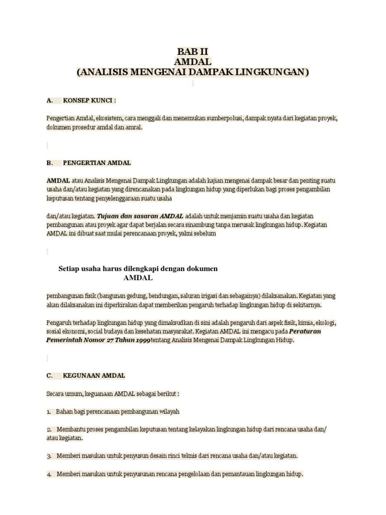 Dokumen amdal merupakan salah satu dokumen lingkungan agar bisa melakukan tindakan terhadap lingkungan seperti yang tertulis dalam dokumen tersebut. Namun, sebagian besar proses amdal memiliki struktur yang sama dan penerapan tahapan utama merupa… Kali ini pakdosen akan membahas tentang amdal?mungkin anda pernah mendengar kata amdal? Analisis dampak lingkungan memiliki tujuan untuk menjaga lingkungan dari dampak yang muncul akibat adanya sebuah rencana proyek atau kegiatan tertentu. 23/12/2021 · posting pada geografi, sma, smp ditag amdal adalah, contoh amdal, contoh artikel tentang amdal, dampak amdal, dampak positif dan negatif amdal, dasar hukum amdal, dasar hukum pembuatan amdal, jelaskan pengertian proyek dalam amdal, jenis jenis amdal, kajian amdal, kegunaan amdal, komponen amdal, makalah amdal, manfaat amdal, manfaat …