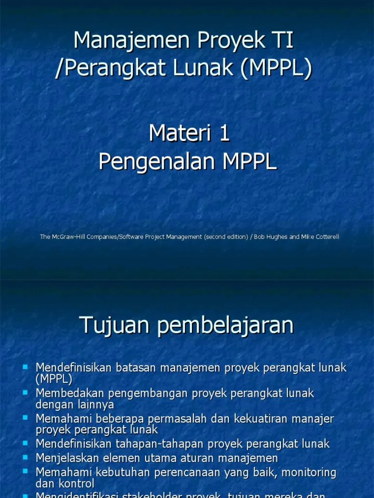 Materi Manajemen Proyek Perangkat Lunak. 29/11/2011 · sebenarnya materi ini baru akan disampaikan besok, namun tidak ada salahnya jika kita baca terlebih dahulu. Dalam buku ini, penulis ingin membawa pembaca terhadap dunia nyata perangkat lunak yang bisa dilihat, diukur dan diketahui prosesnya melalui. :) definisi manajemen proyek perangkat lunak atau lebih sering disingkat dengan mppl, terdiri dari beberapa kata yaitu: Perangkat lunak bagaikan sebuah benda yang ada tapi wujudnya tidak kelihatan, fungsinya dirasakan tapi tidak mudah diikuti. Mengapa manajemen proyek perangkat lunak?.
