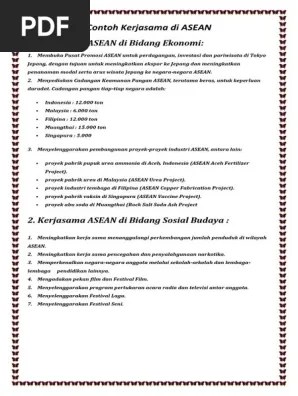 Contoh kerja sama asean di bidang ekonomi: Beberapa proyek industri yang dilakukan oleh asean meliputi industri pupuk yang ada di aceh indonesia dan malaysia, pabrik industri tembaga di filipina, . · proyek pabrik urea di malaysia (asean urea project). Pt asean aceh fertilizer adalah pabrik pupuk urea yang berlokasi di lhokseumawe aceh dan merupakan proyek industri asean yang pertama yang dihasilkan oleh . · 1) industri pupuk urea berada di negara indonesia dan malaysia · 2) industri abu soda yang berada di negara thailand · 3) industri . Proyek pabrik pupuk urea ammonia di aceh, indonesia (asean aceh fertilizer project). Proyek industri asean di indonesia berupa pendirian sebuah proyek pupuk urea. Pabrik pupuk urea di provinsi nanggroe aceh darussalam. 1) industri pupuk urea berada di negara indonesia dan malaysia · 2) industri abu soda yang berada di negara thailand · 3) industri tembaga yang . Beberapa proyek industri asean sebagai berikut.